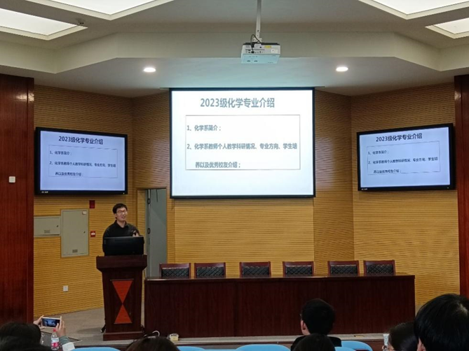 化学系主任舒文明老师结合专业特色,为同学们详细地介绍了化学(师范)专业团队力量、发展方向和专业特点等,还指出,公司化学(师范)专业已完成师范专业认证,这肯定了本专业的教学水平,也助力了同学们的未来就业。最后,舒文明老师对新生表达殷勤希望与嘱托,希望同学们认真做好专业选择和未来职业规划,祝愿同学们在长大度过充实且有意义的老员工活。