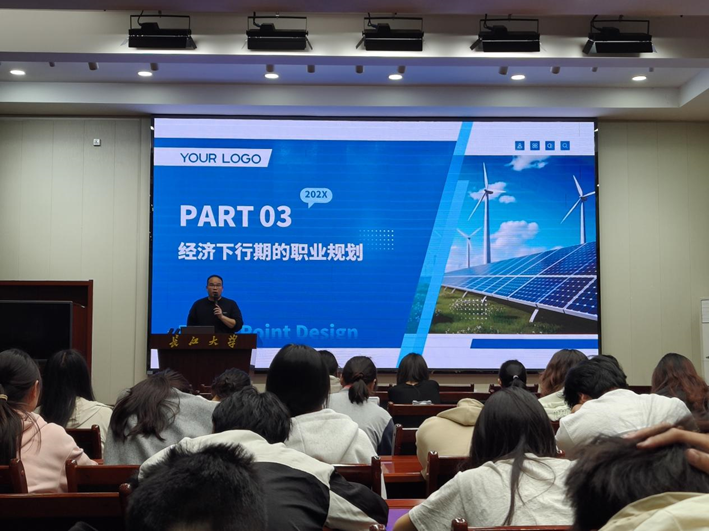 接下来,袁老师从四个方面帮助同学们分析未来职业规划。在考研、考公、就业的选择与权衡上,他从多个层面系统分析每种选择的利弊,助力同学们理性规划未来;在城市选择方面,通过对比不同城市发展机遇,让同学们更清晰认识到各地产业结构的差异,了解自身专业知识与不同城市需求的适配性,从而在未来职业选择时,能够精准锚定方向,做出契合自身发展的决策;围绕经济下行压力下的职业规划给出相应指导,他建议同学们提前布局,培养扎实专业技能,同时,学会在困境中保持积极心态,从容应对求职压力与工作难题;结合自身所处行业,他分析了深圳教育培训行业的发展状况,给同学们带来了新的视野。讲座最后,袁老师寄语同学们,“迷茫时,先做具体的事;选择时,留好翻盘的底牌;顺境时,记得抬头看路”。