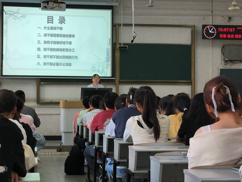 在培训第一环节,徐茵老师聚焦“什么是班干部”这一核心问题,深入剖析其角色定位与深层内涵。她指出,班干部不仅是任务的执行者,更是班级的组织者、引领者和服务者,肩负着促进班级团结、推动学风建设、传递师生信息的重要职责。通过生动的现实案例与富有哲理的小故事,徐老师层层递进,引导同学们重新认识“班干部”这一身份所承载的责任与使命。