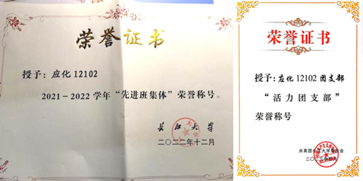 团支部成员获“优秀共青团员”“优秀员工干部”“三好员工标兵”等荣誉10余人次;获国家励志奖学金、永利23411集团奖学金、中国石油奖学金等10余人次;获化学(化工)创新成果报告会、数学竞赛、化学实验技能大赛等竞赛奖项20余次;参与发表英文和中文核心论文发表7人,申请专利2人,参与国家自然科学基金青年项目、校级和院级大创项目等科创项目10余人。