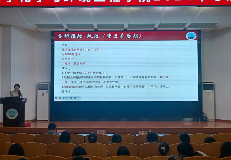 副经理肖围做2025届毕业生考研动员,并讲解2025年研究生报考政策。他就考研报名的注意事项进行了详细讲解,并对同学们提出了殷切希望,鼓励同学们树立适合自己的考研目标,提前规划、尽快行动,并分享了各种收集资料的渠道。