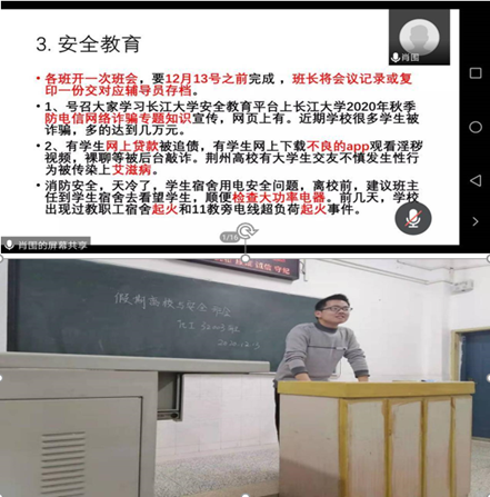 12月13日前,为强调常态化新冠肺炎疫情防控、考试纪律以及寒假期间安全问题注意事项,永利23411集团各班级按照要求通过线上、线下的方式召开了期末安全教育班会。