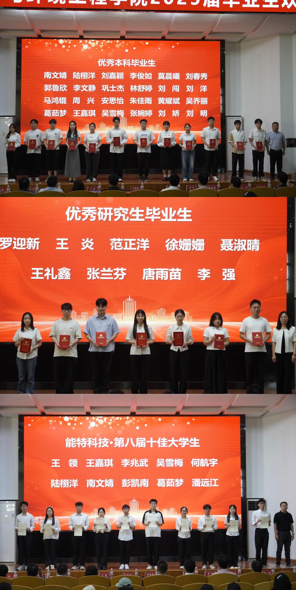 大会在热烈的氛围中拉开帷幕。主持人21级辅导员王娜以真挚的话语,向圆满完成学业的毕业生送上“毕业快乐”的美好祝福,现场掌声雷动。表彰环节中,公司对在学业、科研、实践等领域表现优异的个人与集体进行了表彰。2025届毕业生以笔为刃、以梦为马,共有136名本科生、8名研究生成功考入清华大学、南京大学等高等学府继续深造读硕读博,吴雪梅等21位同学作为考研优秀个人上台领奖;高材12102、化工12101等6个班级以及23栋A404等3个寝室,以卓越的团队协作精神脱颖而出,荣获考研先进班集体和考研优秀寝室荣誉称号;邓智豪、焦珂宣等19位员工,代表2025届57名优秀毕业生上台领奖,他们在校期间努力学习,全面发展,以青春之笔,书写了拼搏奋进的壮丽篇章;最后压轴登台的是荣获永利23411集团“能特科技·第八届十佳老员工”称号的10位同学,能特科技董事长张光忠先生亲自为他们颁奖。每一个奖项的宣读,都伴随着热烈的掌声与欢呼声,彰显着化工学子的风采与荣耀。