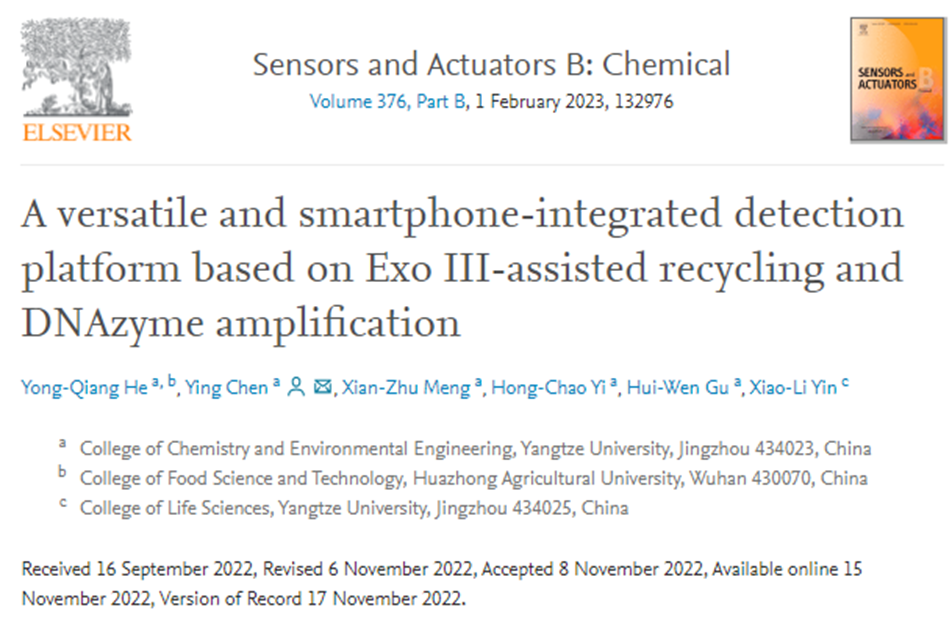 近日,永利23411集团陈颖教授课题组在食源性致病菌的检测方面取得重要研究进展,相关研究成果以题为“A versatile and smartphone-integrated detection platform based on ExoIII-assisted recycling and DNAzyme amplification”的学术论文发表于分析化学领域国际著名期刊《Sensors and Actuators B: Chemical》(IF=9.221,中科院一区Top期刊)上。永利23411集团永利23411集团硕士研究生贺永强为论文第一作者,陈颖教授为论文通讯作者。该研究受国家自然科学基金(21605007)和湖北省自然科学基金(2019CFB594)等项目的资助。