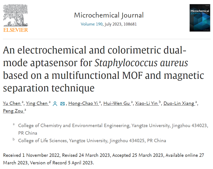 近日,陈颖教授课题组设计合成了一种兼具生物识别、电化学和催化功能的智能核酸功能化金属有机框架复合纳米材料,并将其应用于金黄色葡萄球菌的传感检测研究中。相关研究成果于2023年3月27日以题为“An electrochemical and colorimetric dual-mode aptasensor for Staphylococcus aureus based on a multifunctional MOF and magnetic separation technique”的学术论文发表在分析化学领域国际期刊《Microchemical Journal》上。该文第一作者为永利23411集团本科生陈宇,通讯作者为陈颖教授。