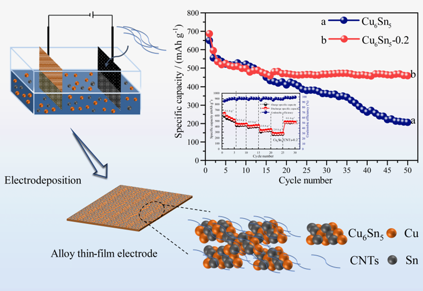 电子产品更新迭代对锂离子电池的安全性和耐久性提出了更高要求,开发新型负极材料助力高能量密度锂离子电池十分关键。已报道的Cu-Sn二元合金中,金属间化合物Cu6Sn5能量最低,结构最稳定。此外,Cu不与Li反应,而是作为一种非活性缓冲相来缓解锂化过程中产生的机械应力,从而提高了合金负极材料的循环性能。电子产品升级换代给锂离子电池能量密度带来技术挑战的同时也产生了大量的废弃印刷电路板,含有各种贵重金属(Au、Ag、Pt、Cu、Sn等),如何利用废弃印刷线路板中富含的Cu、Sn金属制备Cu6Sn5合金薄膜电极受到了研究者的关注。锡基材料因较高的理论容量而被认为是极具潜力的锂离子电池负极材料。然而,由于合金化和去合金化过程中存在体积膨胀效应,使得电池容量迅速衰减,限制了实际应用。